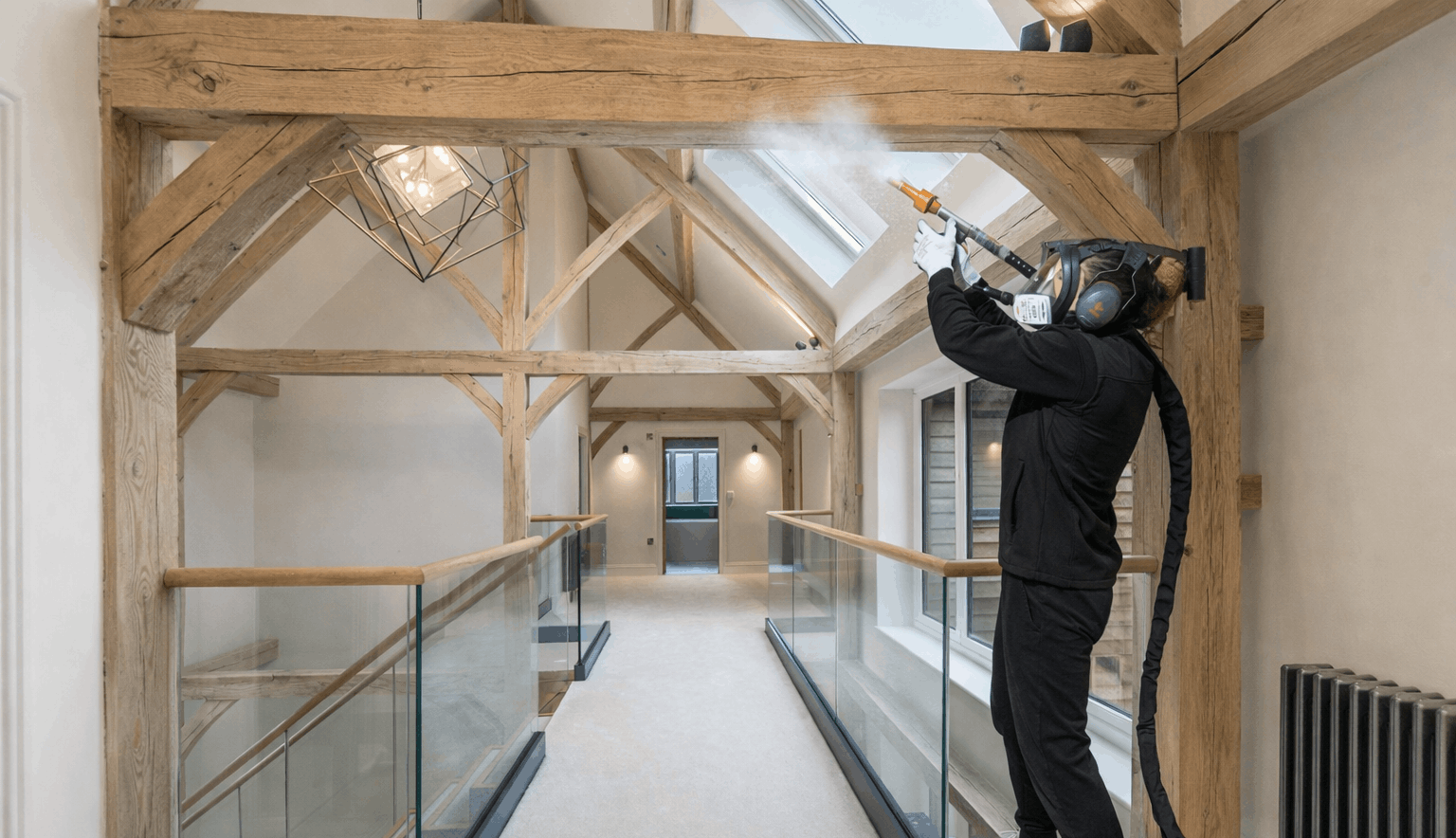Precision dry ice cleaning for wooden beams, oak beams and woodwork removing paint and coatings and restoring natural character.