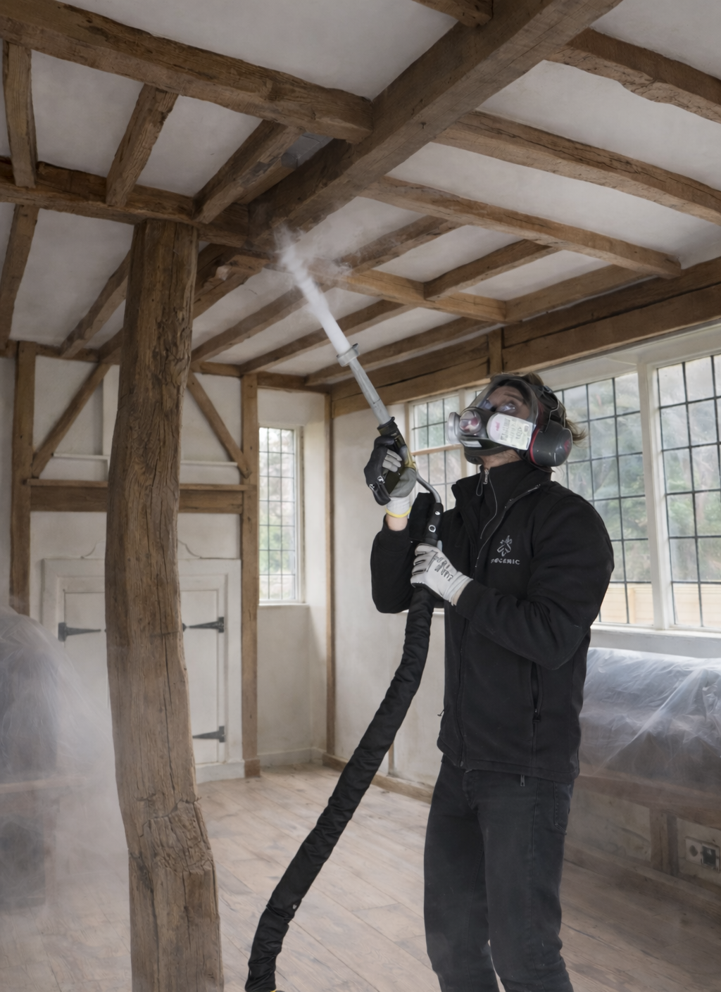 Insurance approved dry ice blasting for spray foam insulation removal from lofts, rafters and beams, supporting mortgage compliance.